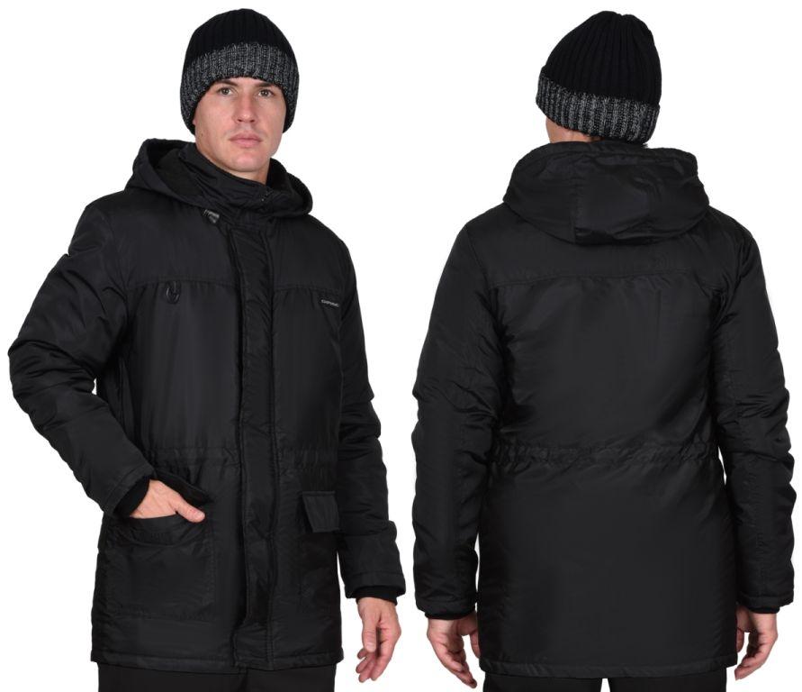 Куртка прямого силуэта, удлинённая, с утеплённой подкладкой, с центральной застежкой молния до края воротника, с ветрозащитным клапаном до горловины, с втачным воротником-стойка и втачным капюшоном, с втачными рукавами с внутренней трикотажной манжетой, с нижними накладными карманами с клапаном и карманом на подкладке. Куртка с кулиской по талии. Подкладка куртки утеплённая, верхняя часть подкладки из флиса, нижняя часть и рукава из подкладочной полиэфирной ткани. В куртке предусмотрено крепление для бейджа.