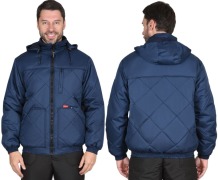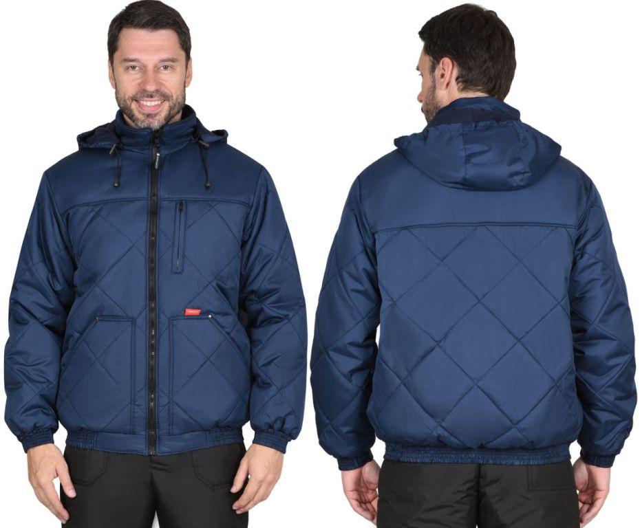 Куртка утеплённая, укороченная, по низу на притачном поясе с эластичной лентой, на подкладке из флиса, со съёмным капюшоном, с центральной бортовой застёжкой на молнию и воротником стойка. Изделие с верхним нагрудным прорезным и нижними накладными карманами. Рукава втачные с притачными манжетами, манжеты частично стянуты на эластичную ленту. Полочки, спинка, рукава и нижние карманы куртки выстеганы с утеплителем в виде ромбов.