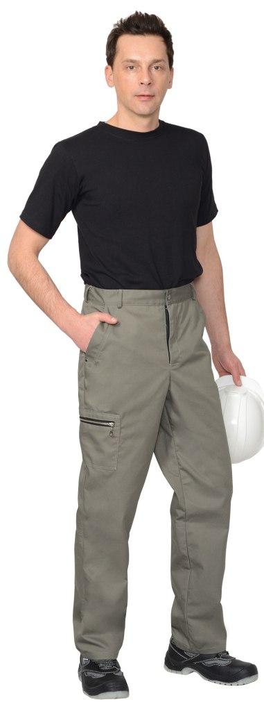 Брюки прямого покроя; с центральной застежкой гульфика на тесьму - «молния», с притачным поясом, застёгивающимся на кнопку; Передние половинки с внутренними боковыми карманами с наклонным входом, нижние углы карманов закреплены закрепками отделочными нитками и хольнитенами. Задние половинки с двумя накладными карманами с нижним объемом. На правом боковом шве брюк настрочен карман, с горизонтальным входом в карман, застёгивающийся на металлическую тесьму «молнию».