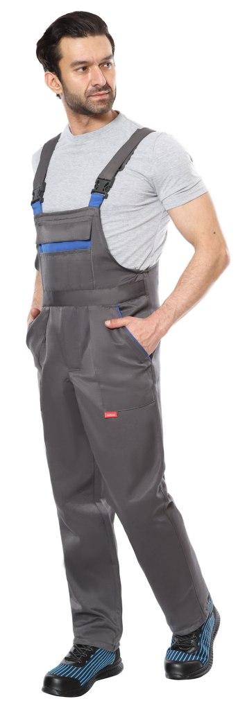 Полукомбинезон с застежками на пуговицы: спереди на гульфик и в правом боковом шве. С различными карманами на передних и задних половинках. С двойным нагрудным карманом с клапаном на липучке. Сзади полукомбинезон по талии стянут резинкой для лучшего прилегания по фигуре. Бретели выполнены из резинки, длина бретелей регулируется при помощи застежек-фастексов.