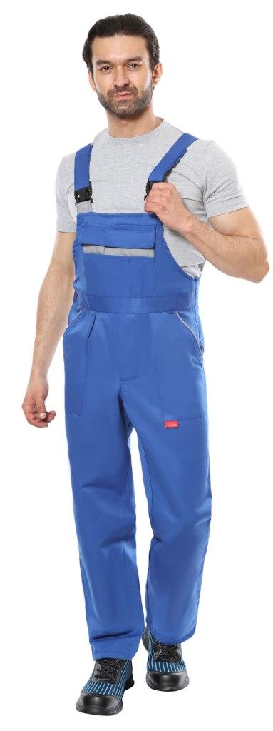 Полукомбинезон с застежками на пуговицы: спереди на гульфик и в правом боковом шве. С различными карманами на передних и задних половинках. С двойным нагрудным карманом с клапаном на липучке. Сзади полукомбинезон по талии стянут резинкой для лучшего прилегания по фигуре. Бретели выполнены из резинки, длина бретелей регулируется при помощи застежек-фастексов.