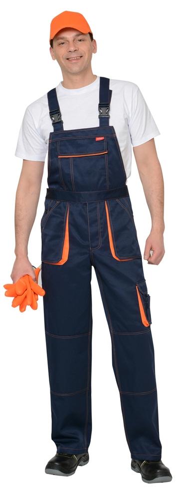Полукомбинезон - прямой с контрастной отделкой, с бретелями, с застёжкой спереди и с застёжкой в правом боковом шве на три петли и три пуговицы. Полукомбинезон с различными многофункциональными карманами, спинка с частичной стяжкой по талии для лучшего прилегания по фигуре.