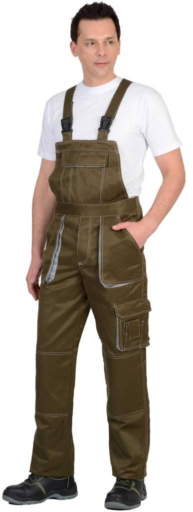 Полукомбинезон - прямой с контрастной отделкой, с бретелями, с застёжкой спереди и с застёжкой в правом боковом шве на три петли и три пуговицы. Полукомбинезон с различными многофункциональными карманами, спинка с частичной стяжкой по талии для лучшего прилегания по фигуре.