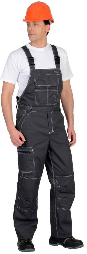 Полукомбинезон с застёжкой спереди - гульфик с молнией и с застёжкой в правом боковом шве на пуговицы, с наколенниками, с бретелями. Полукомбинезон спереди с боковыми внутренними карманами и нагрудным карманом с клапаном, на липучке. Сзади полукомбинезон по талии стянут резинкой для лучшего прилегания по фигуре, на правом боковом шве на уровне колена карман с молнией. Бретели с резинкой, длина бретелей регулируется застежкой-фастексом. В полукомбинезоне спереди предусмотрен светоотражающий кант для обозначения сигнальной видимости.