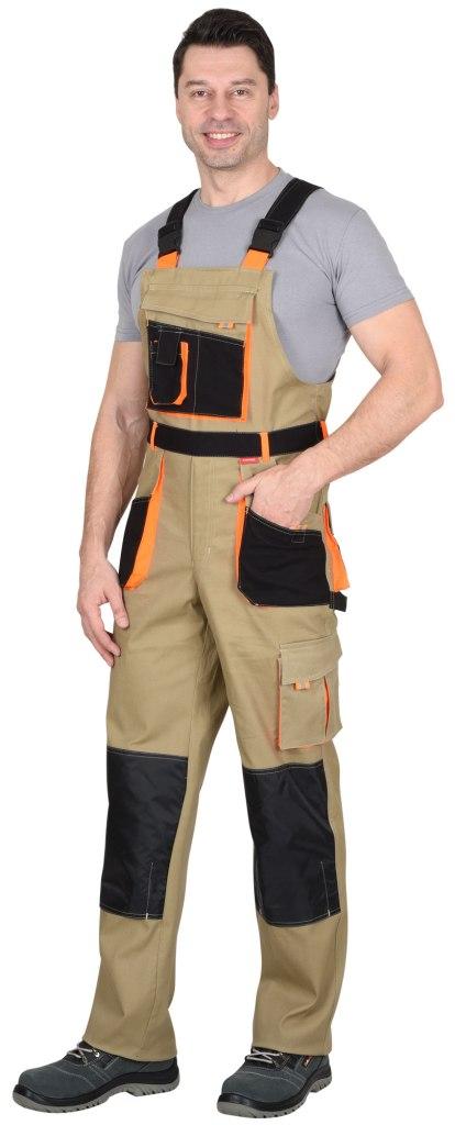 Полукомбинезон с застежкой гульфика на «молнию» и с застежкой в правом боковом шве на три петли и три пуговицы, с нагрудным накладным большим и малым карманом и карманом для телефона, с боковыми внутренними карманами, с накладным карманом на левом боковом шве с клапаном на липучке, с наколенниками, с двумя задними карманами с клапанами , и карманом для инструментов, по спинке вставлена резинка.