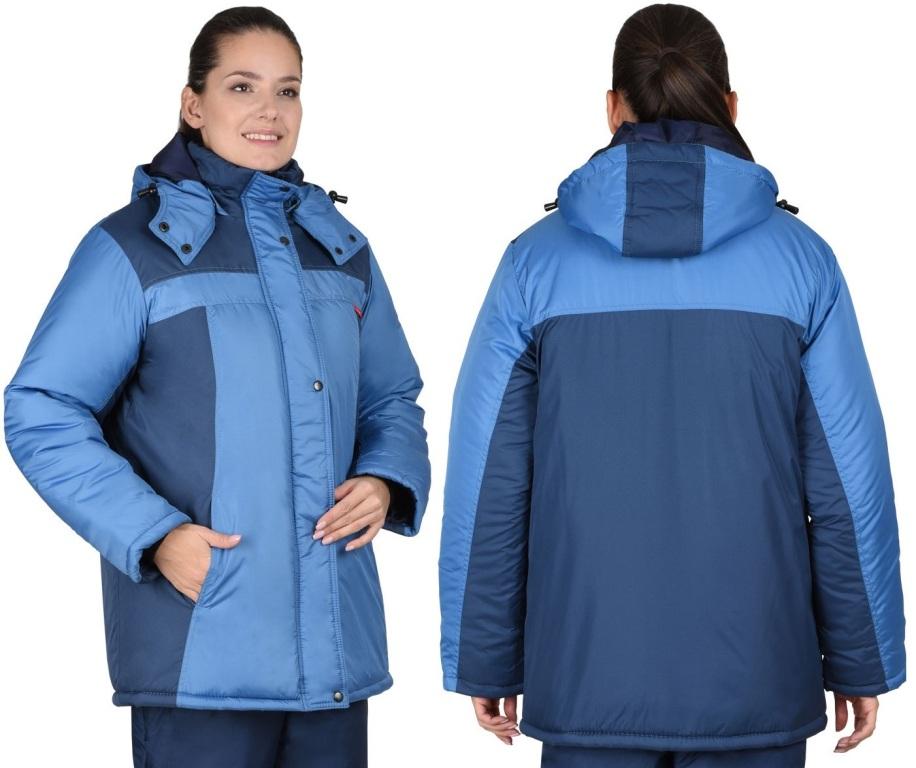 Куртка женская, прямого силуэта, с притачной утеплённой подкладкой, с центральной бортовой застёжкой на двухзамковую тракторную тесьму «молния» и внешним ветрозащитным клапаном с 5-ю кнопками; с воротником «стойка» и съёмным утеплённым капюшоном; с боковыми карманами в рельефных швах.